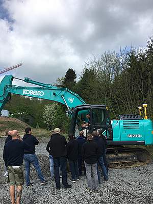 Neben Timo Hofmann vom Hersteller Trimble waren zwanzig Service- und Support Mitarbeiter von SITECH aus dem gesamten Bundesgebiet vor Ort, um die unterschiedlichen Ausbaustufen ab Werk kennenzulernen und die reibungslose Integration von Trimble Earthworks und der Automatik am praktischen Objekt zu trainieren